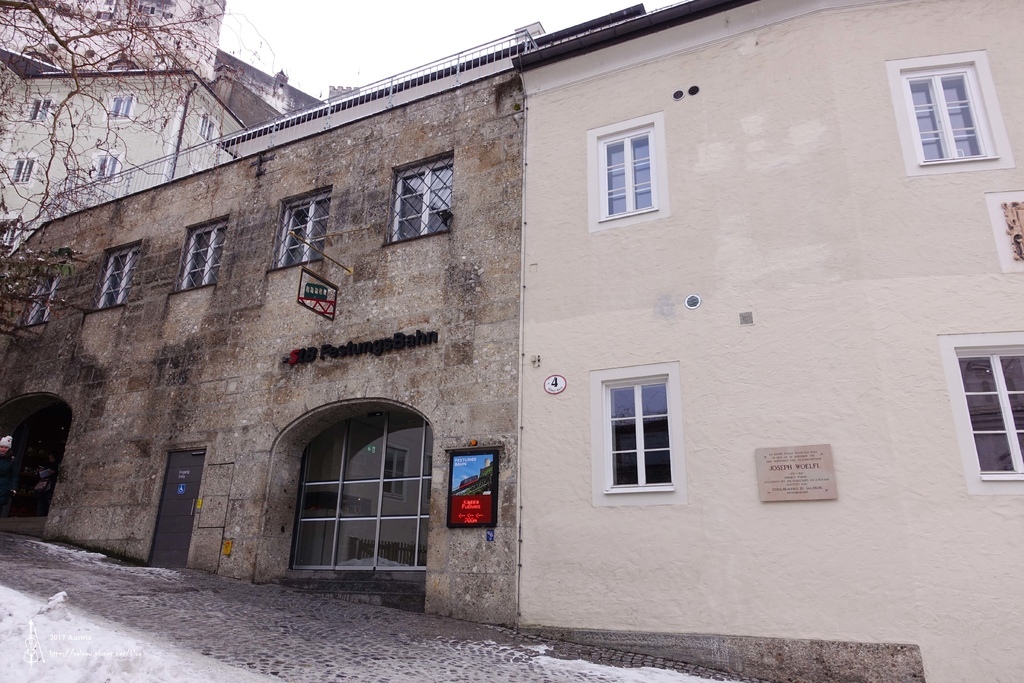 終於抵達纜車入口 拿薩爾斯堡卡給櫃台看就可以快速搭纜車上要塞